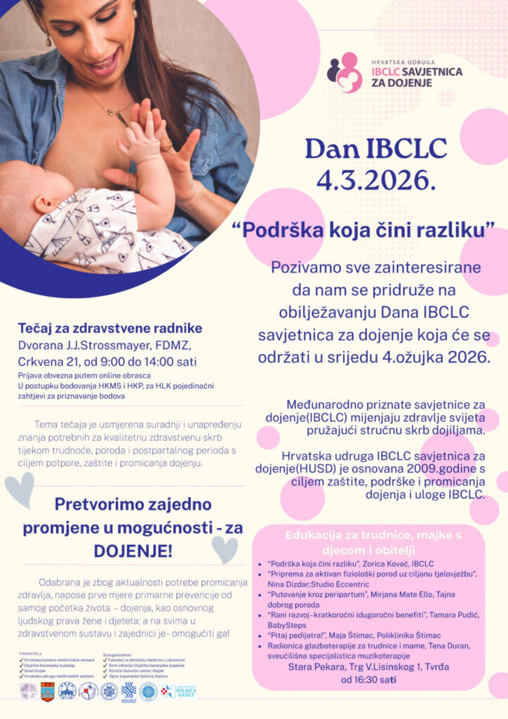 velika nam je čast i zadovoljstvo pozvati Vas na tečaj za zdravstvene radnike koji je organizirala Hrvatska udruga IBCLC savjetnica za dojenje povodom obilježavanja Dana IBCLC, prve srijede u ožujku.